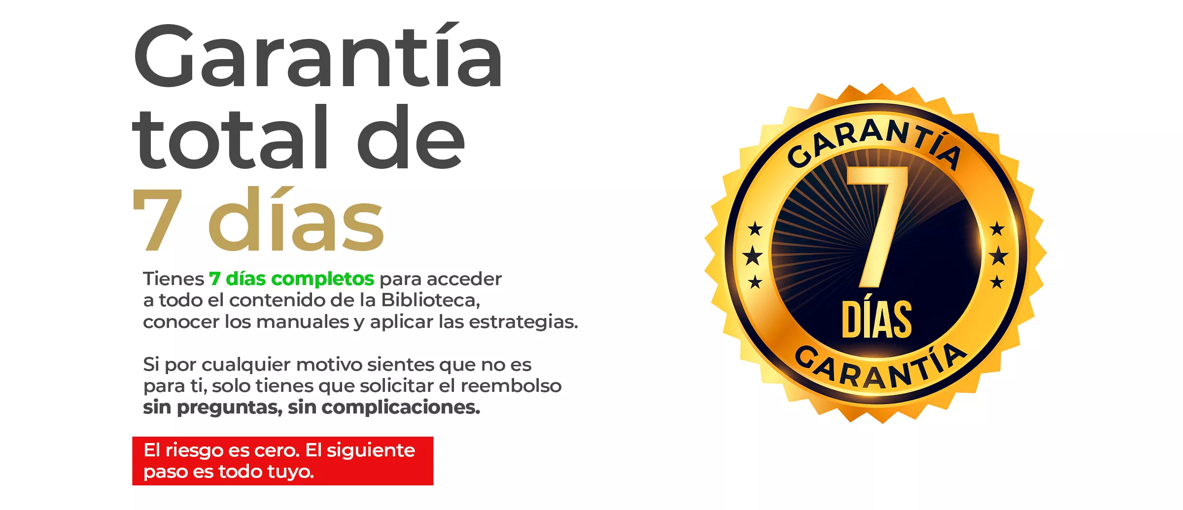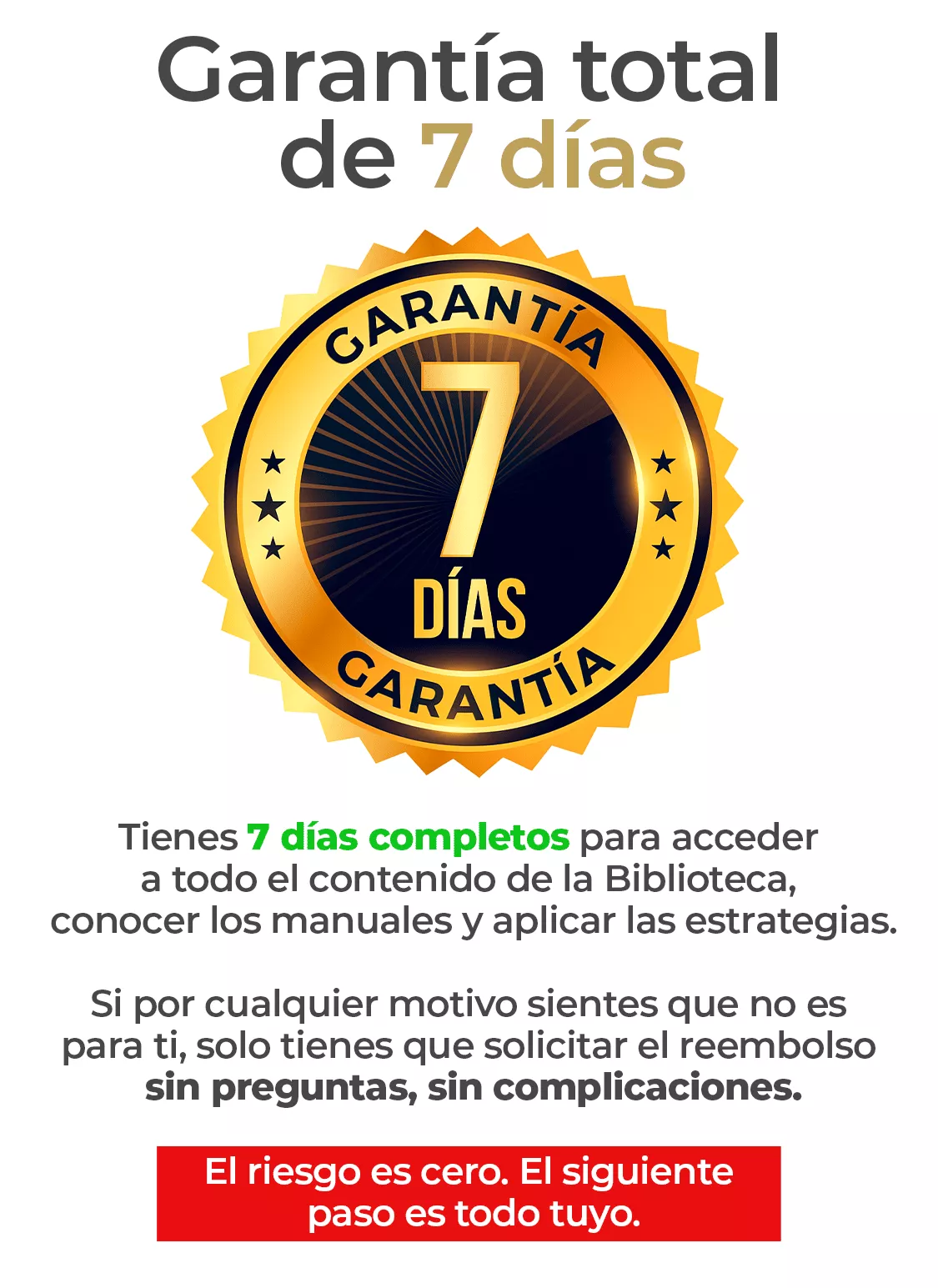 Cuentas con una Garantía Total de 7 días. Puedes entrar, explorar todo el arsenal y, si sientes que no es lo que buscabas, solo tienes que solicitar el reembolso total sin preguntas ni complicaciones. El riesgo es cero.